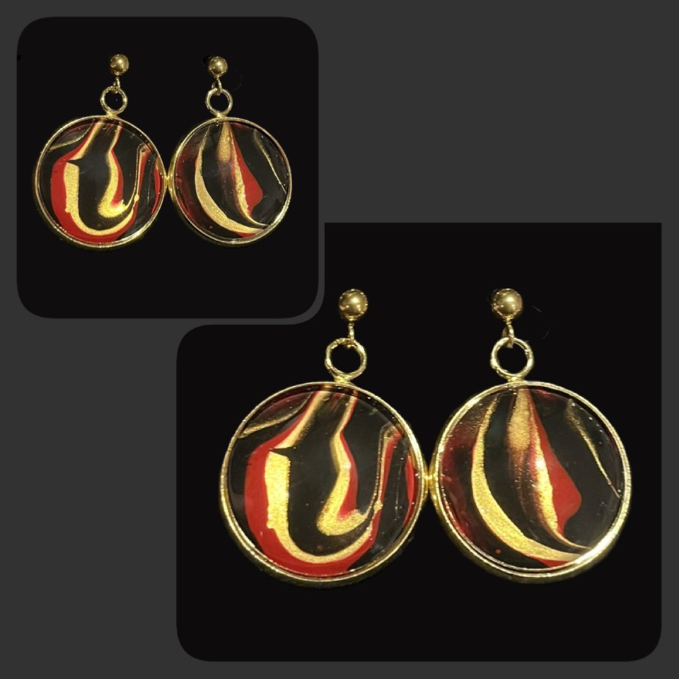 Örhängen i guldpläterat stål, bly- och nickelfritt. Slät baksida. Stift och stopp i kirurgiskt stål (bly- och nickelfritt). Cabochonen är 20mm, totallängd 2,9cm.