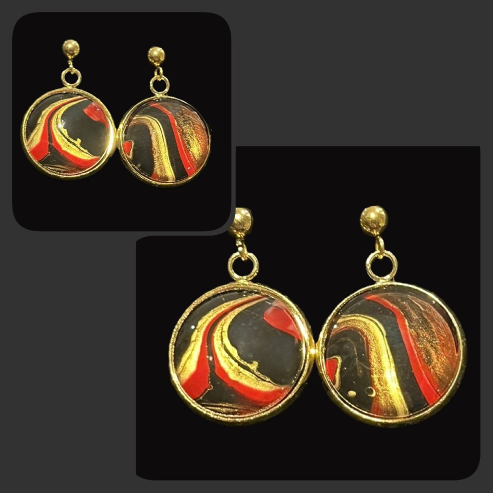 Örhängen i guldpläterat stål, bly- och nickelfritt. Slät baksida. Stift och stopp i kirurgiskt stål (bly- och nickelfritt). Cabochonen är 16mm, totallängd 2,6cm